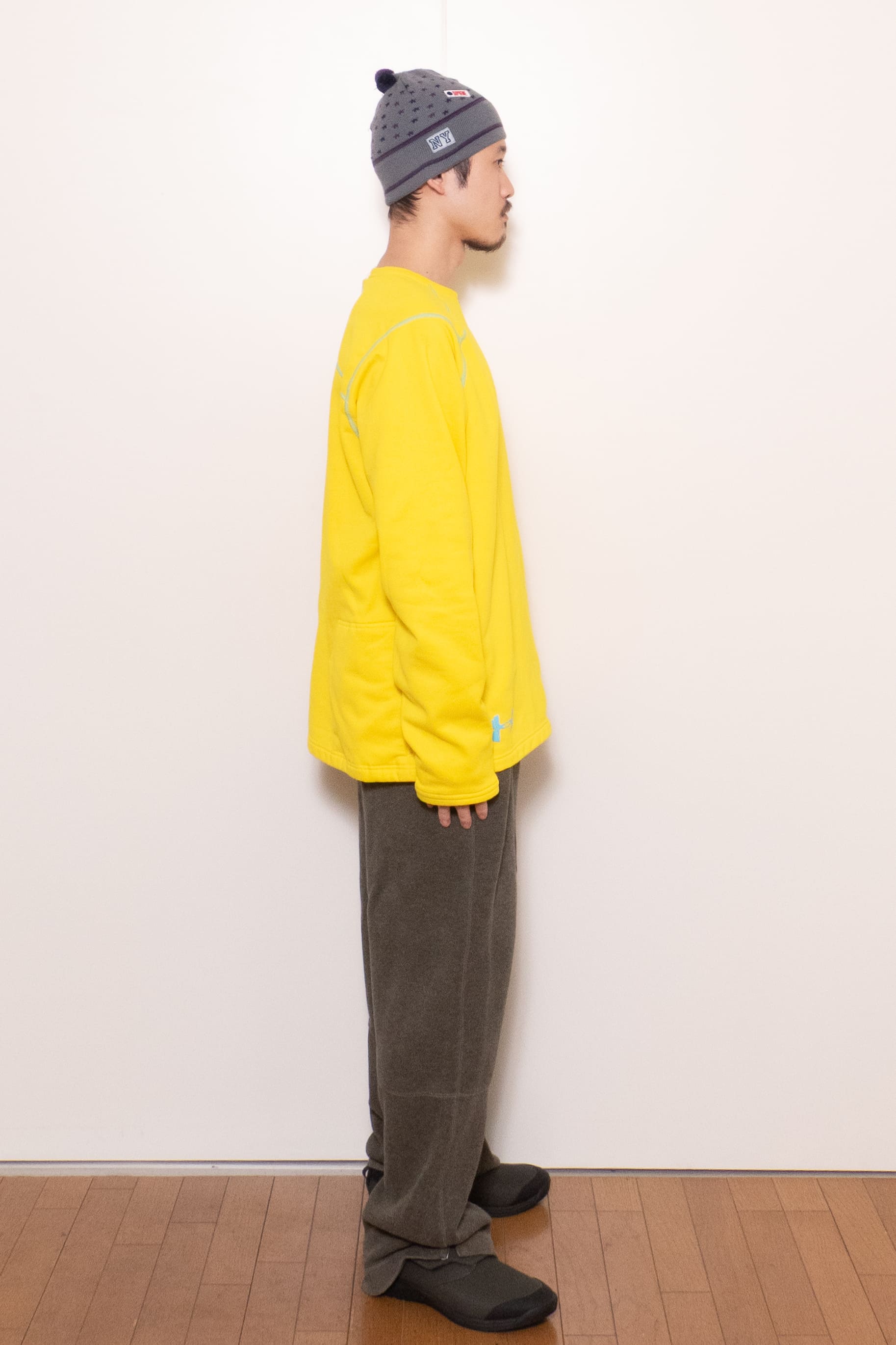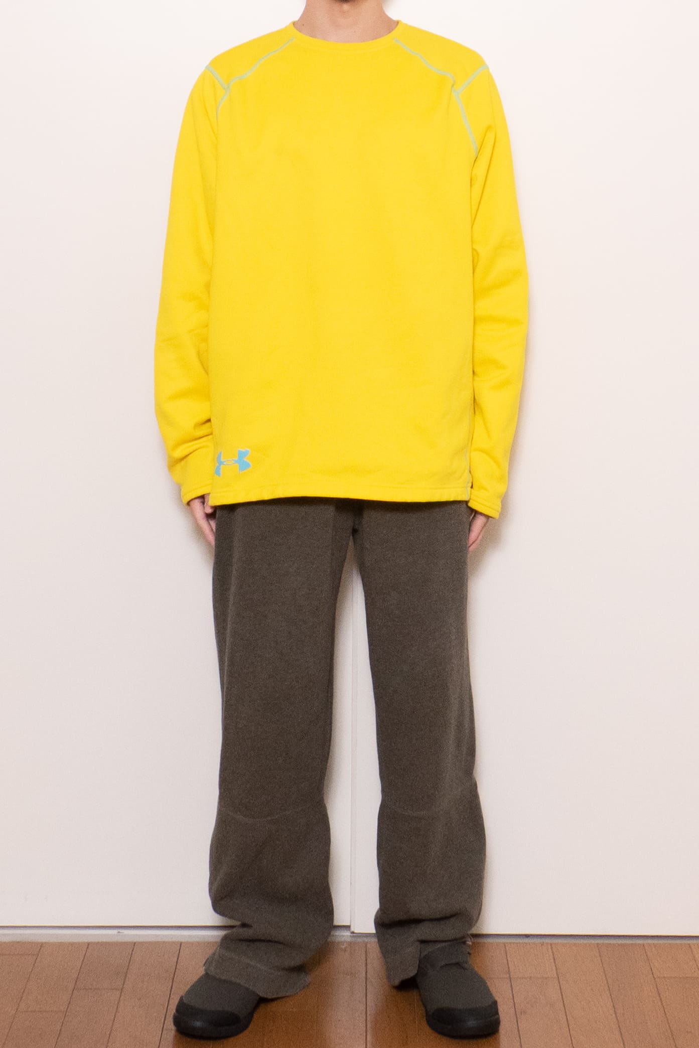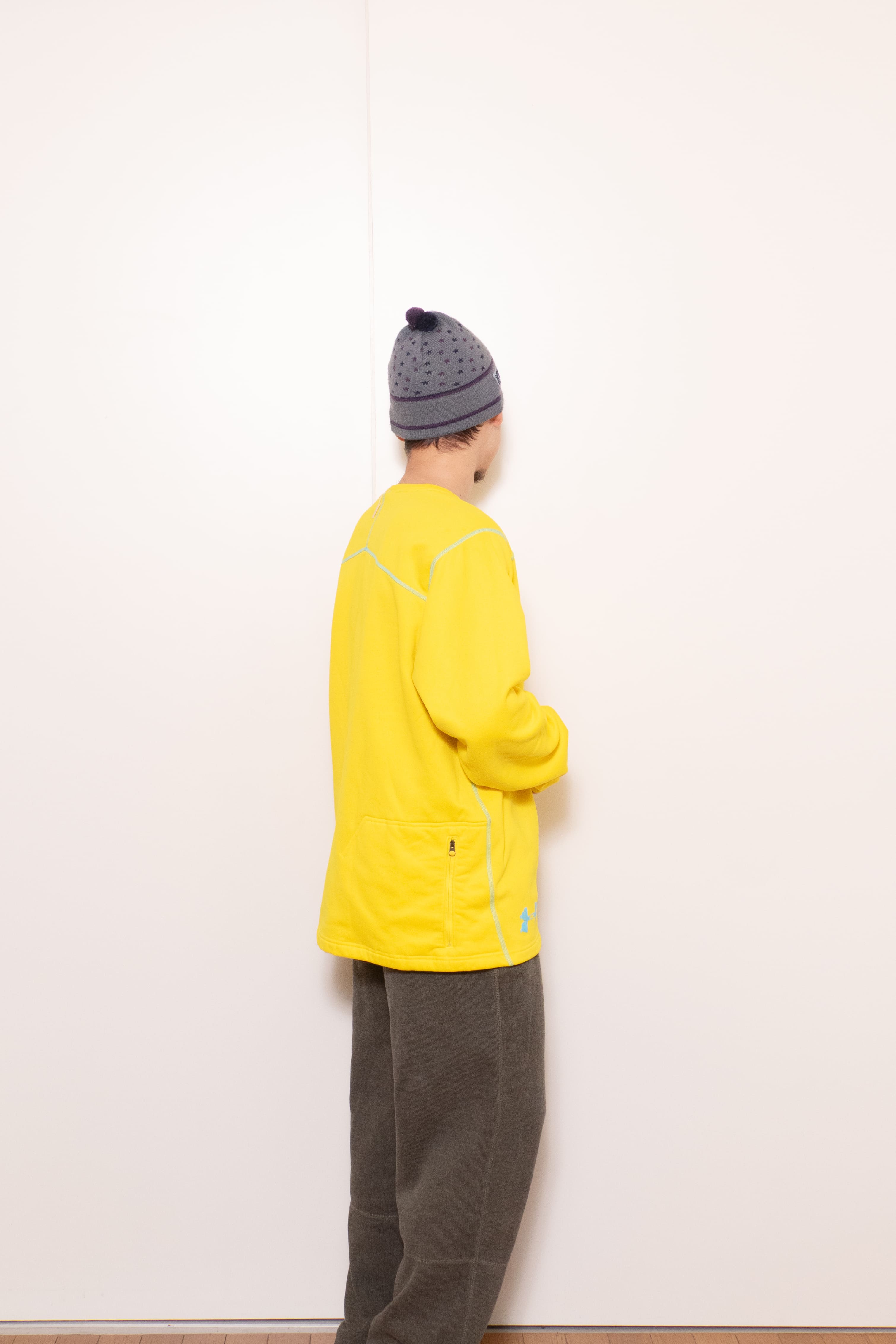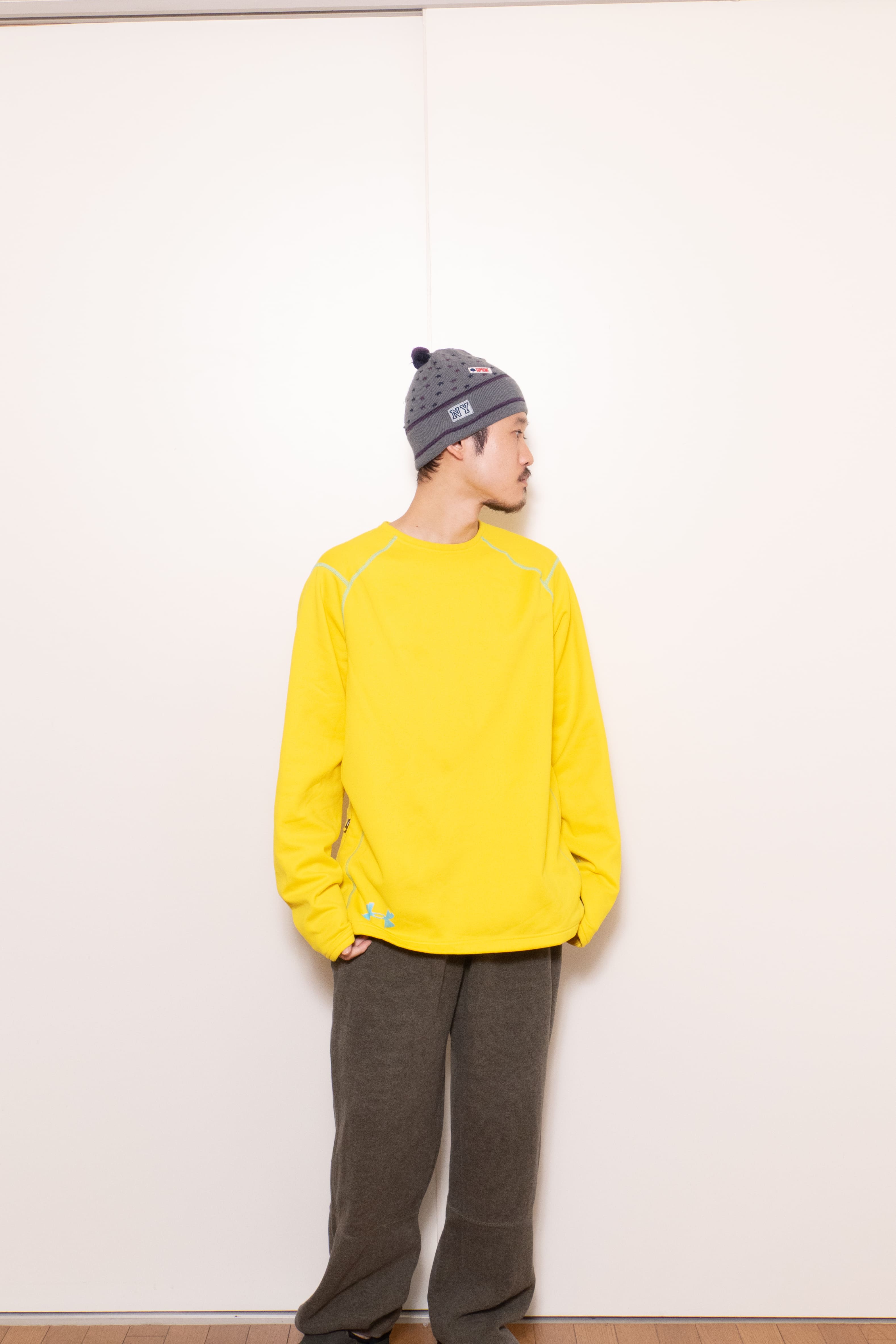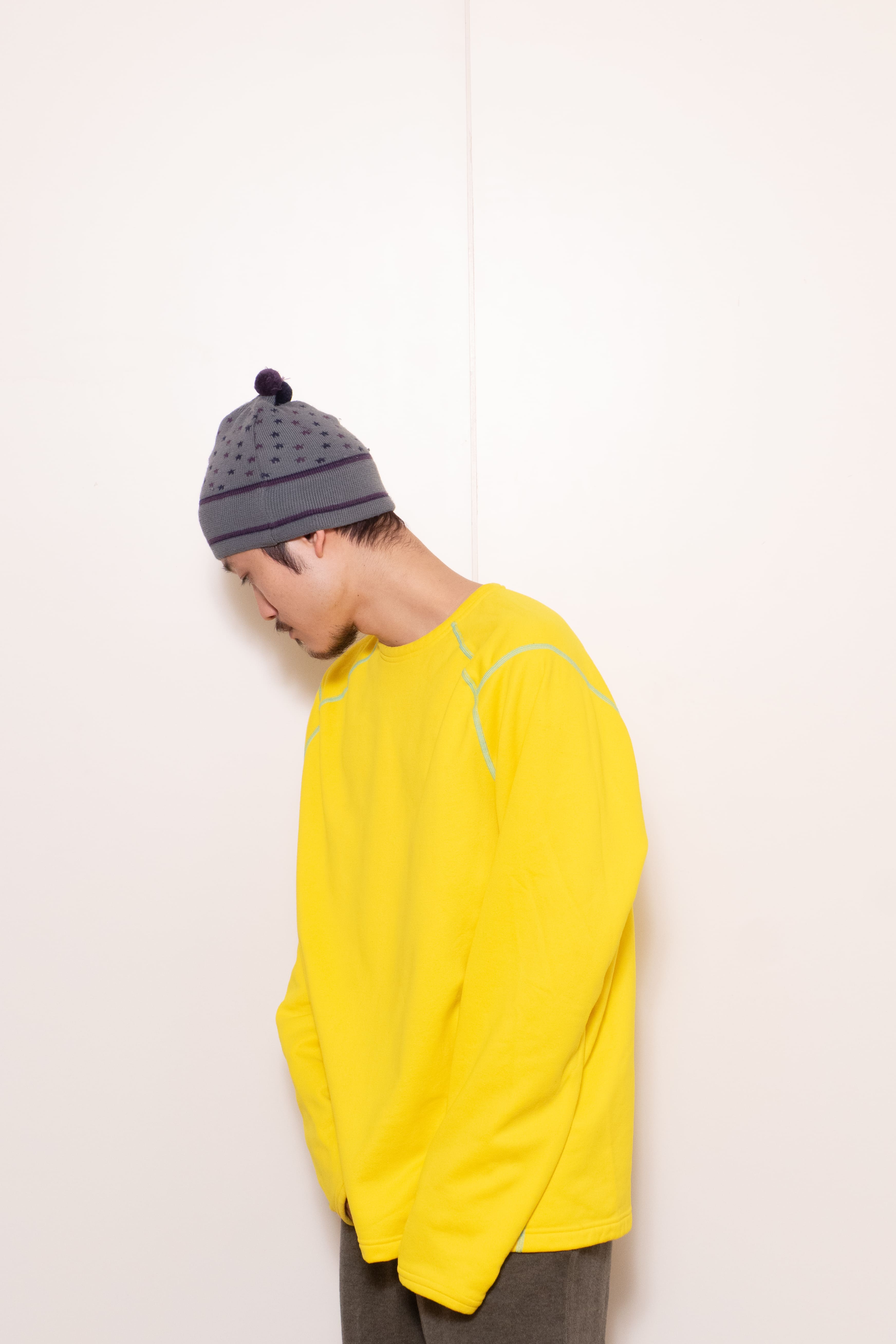 元気な発色の良い黄色に水色のステッチ。冬に着たい、発色の良くて暖かいインナーです。