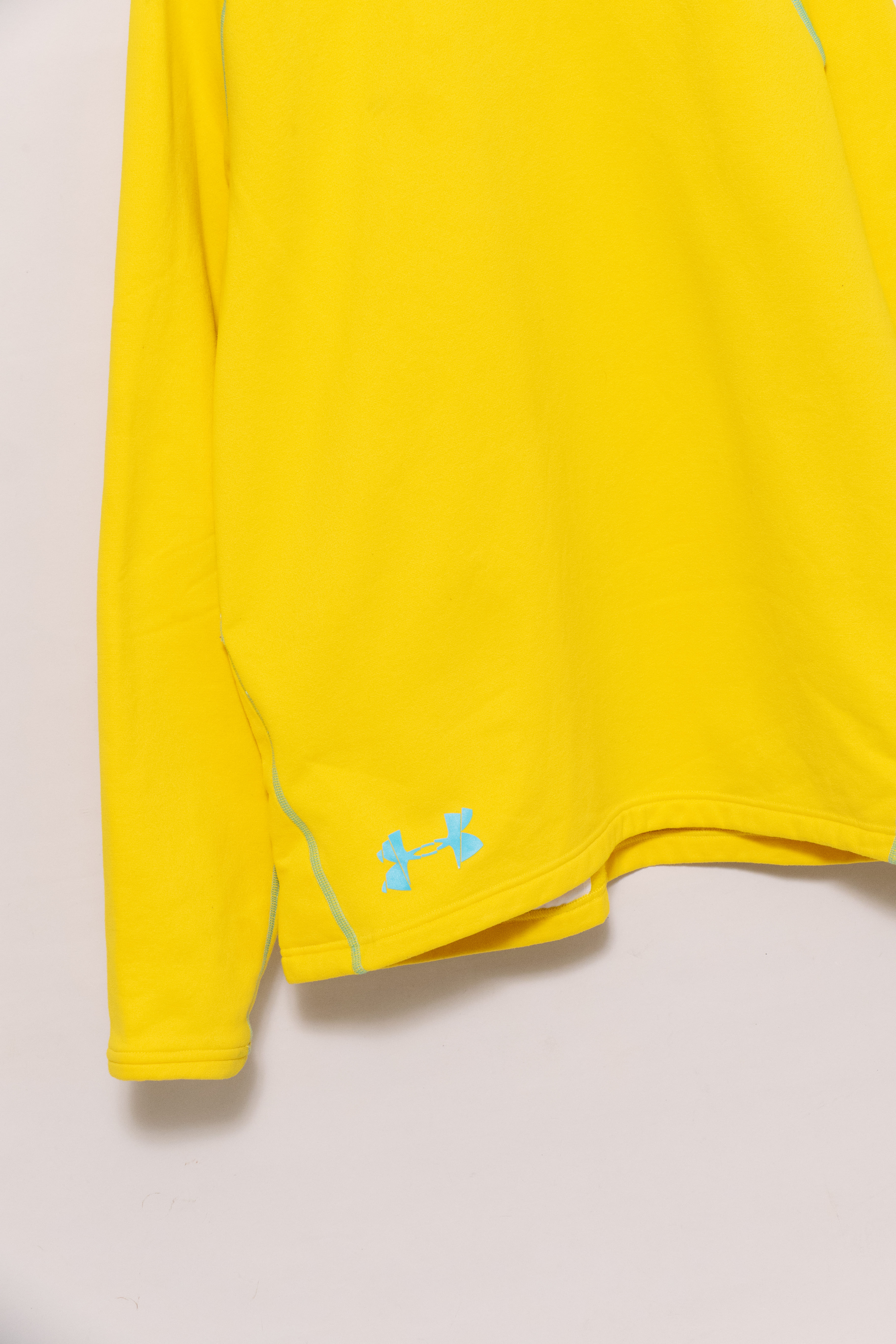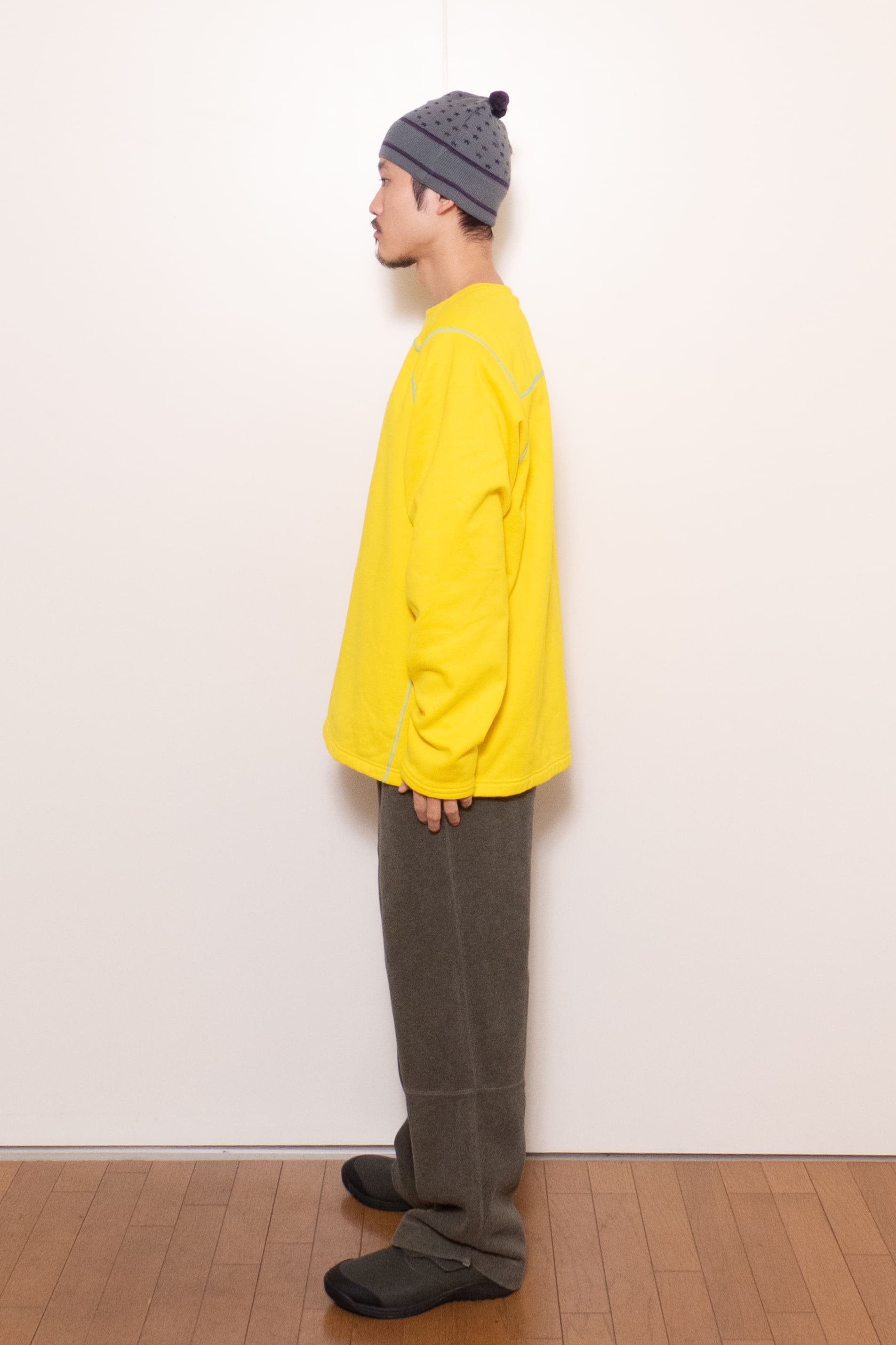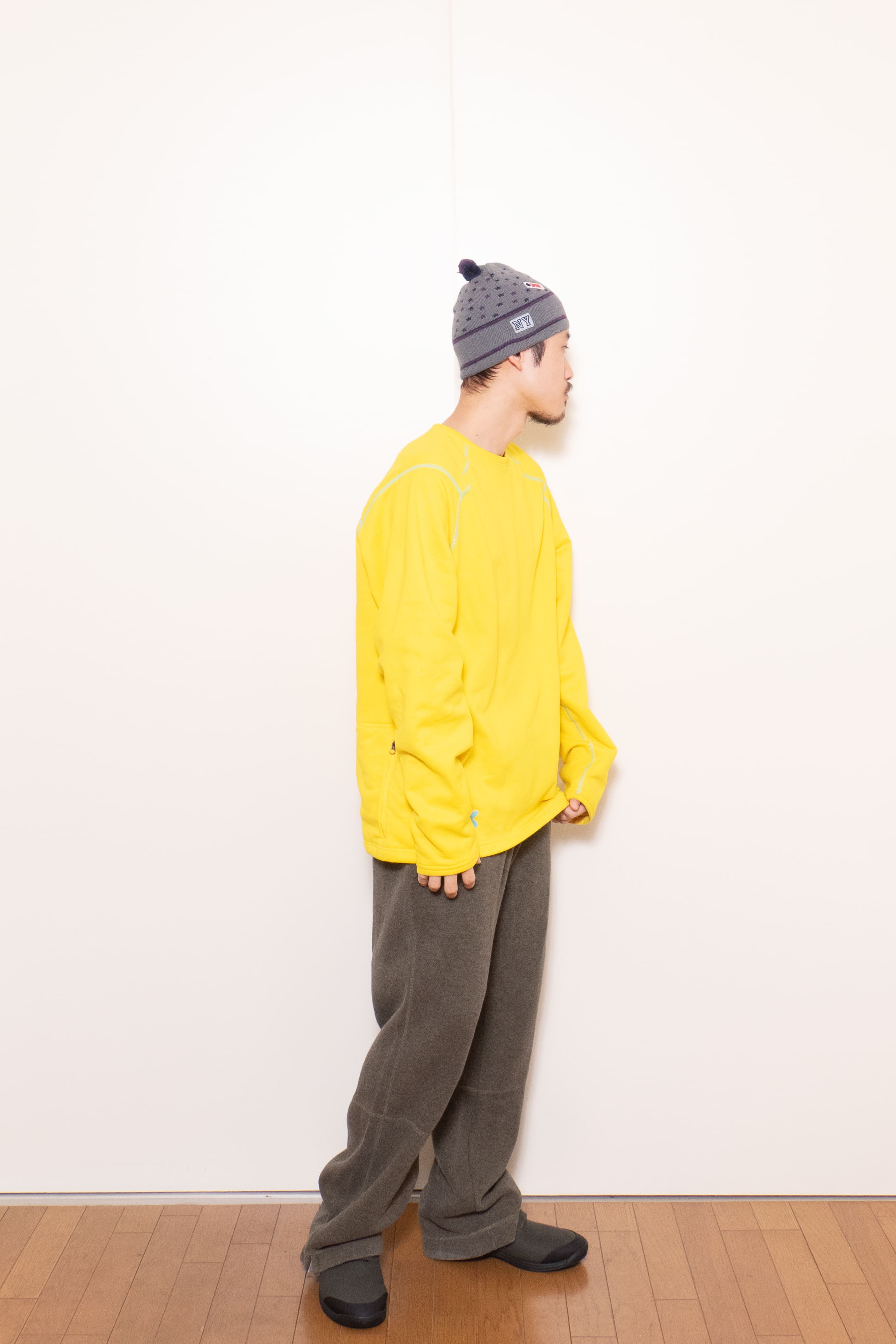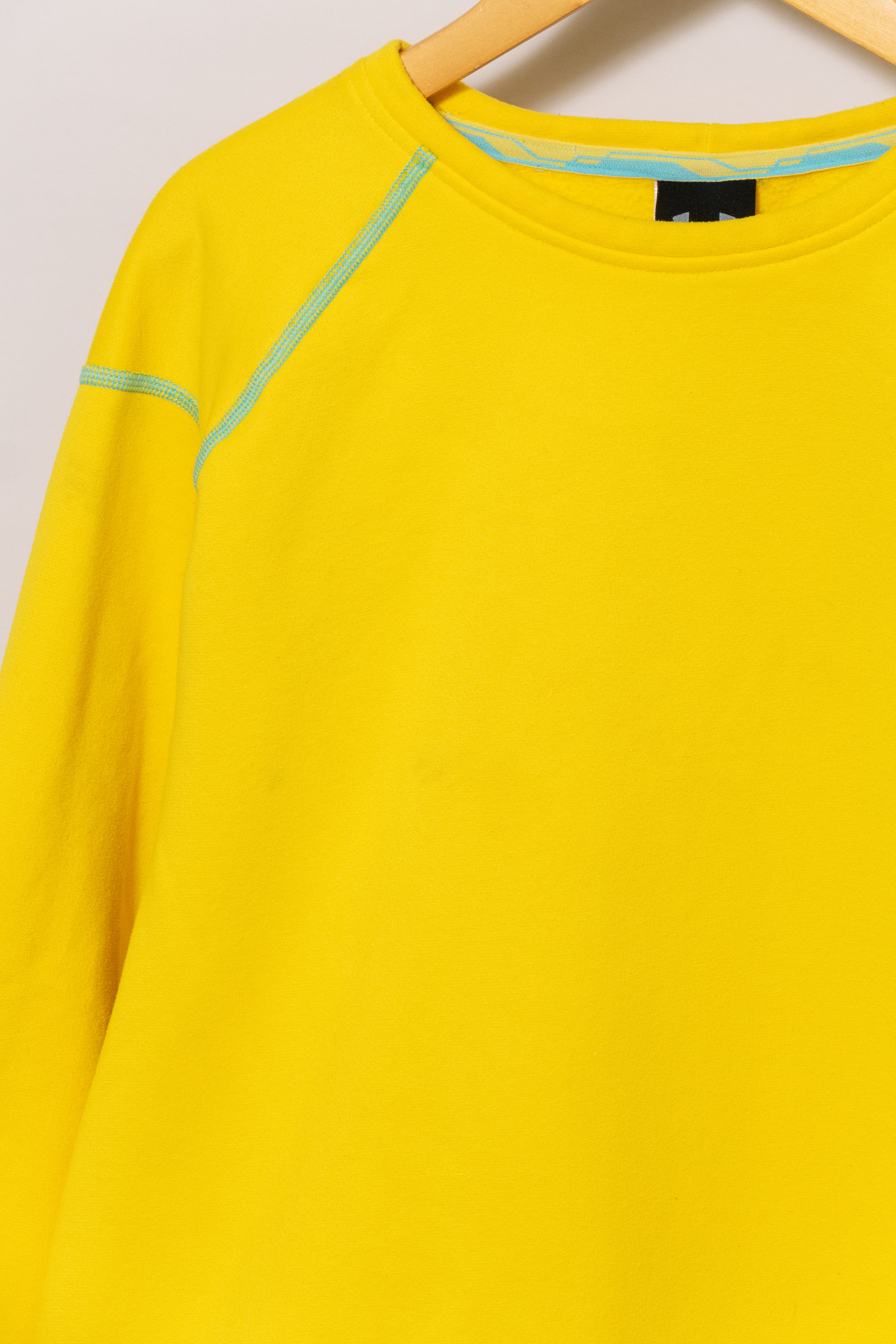 元気な発色の良い黄色に水色のステッチ。冬に着たい、発色の良くて暖かいインナーです。