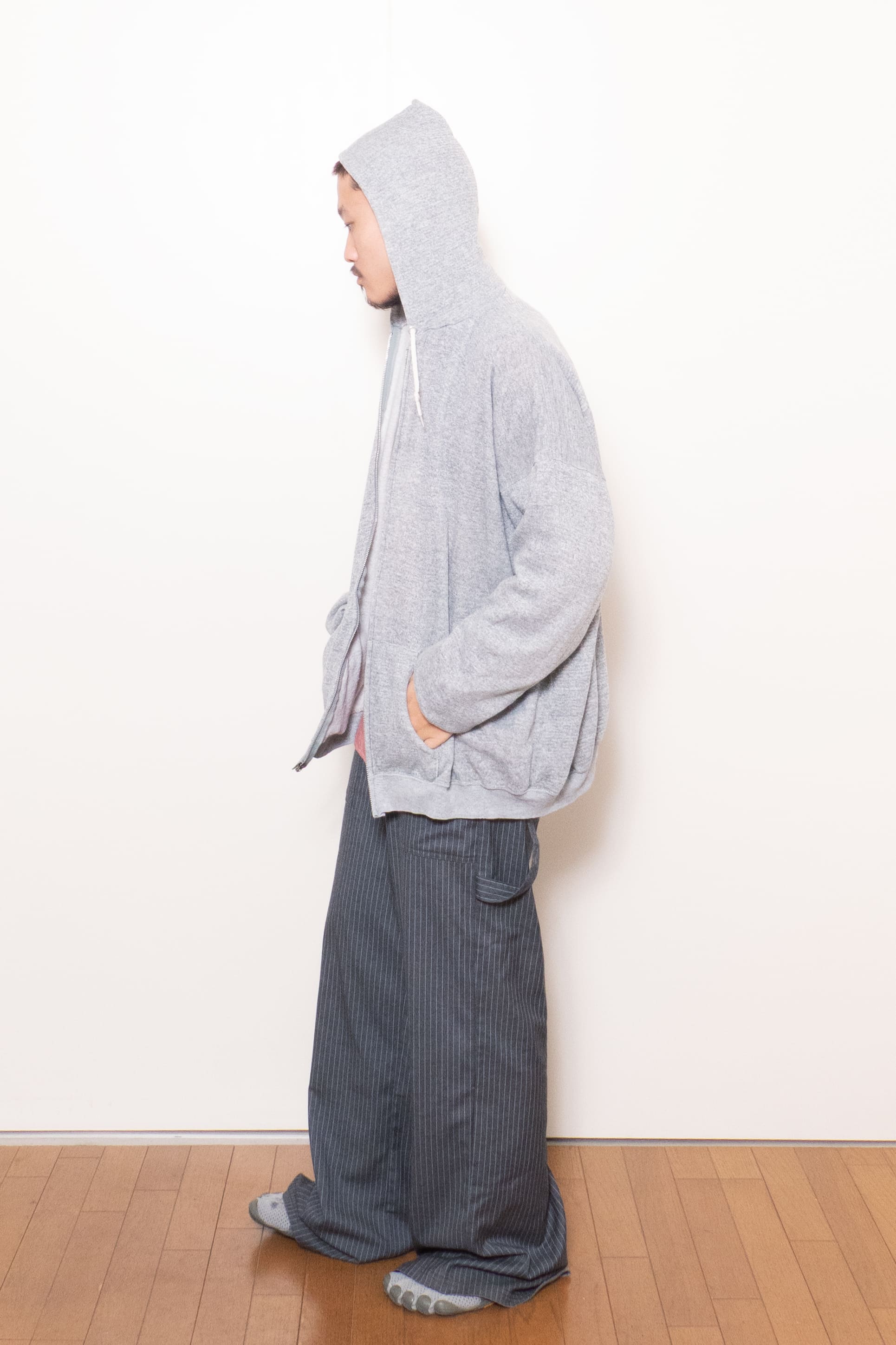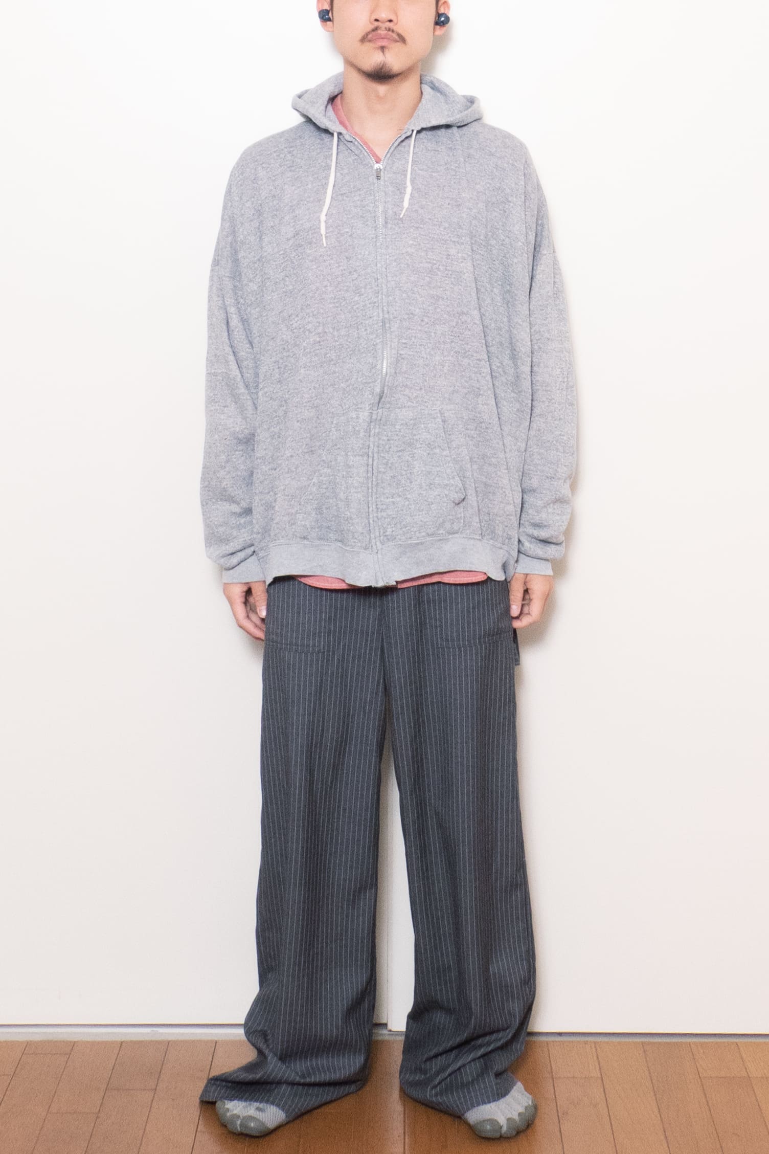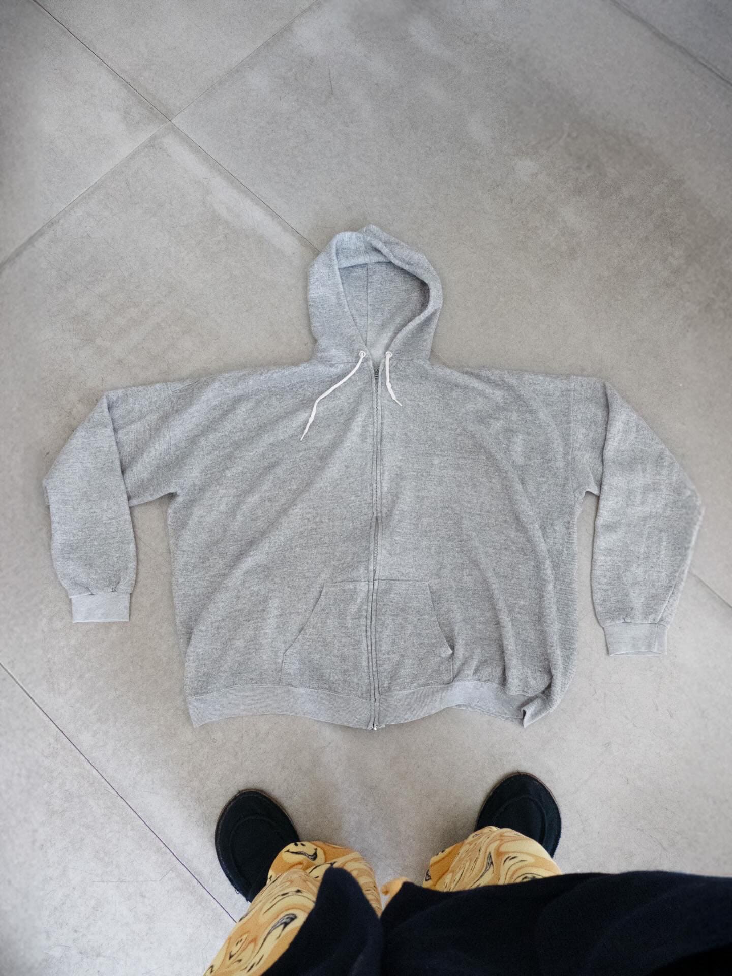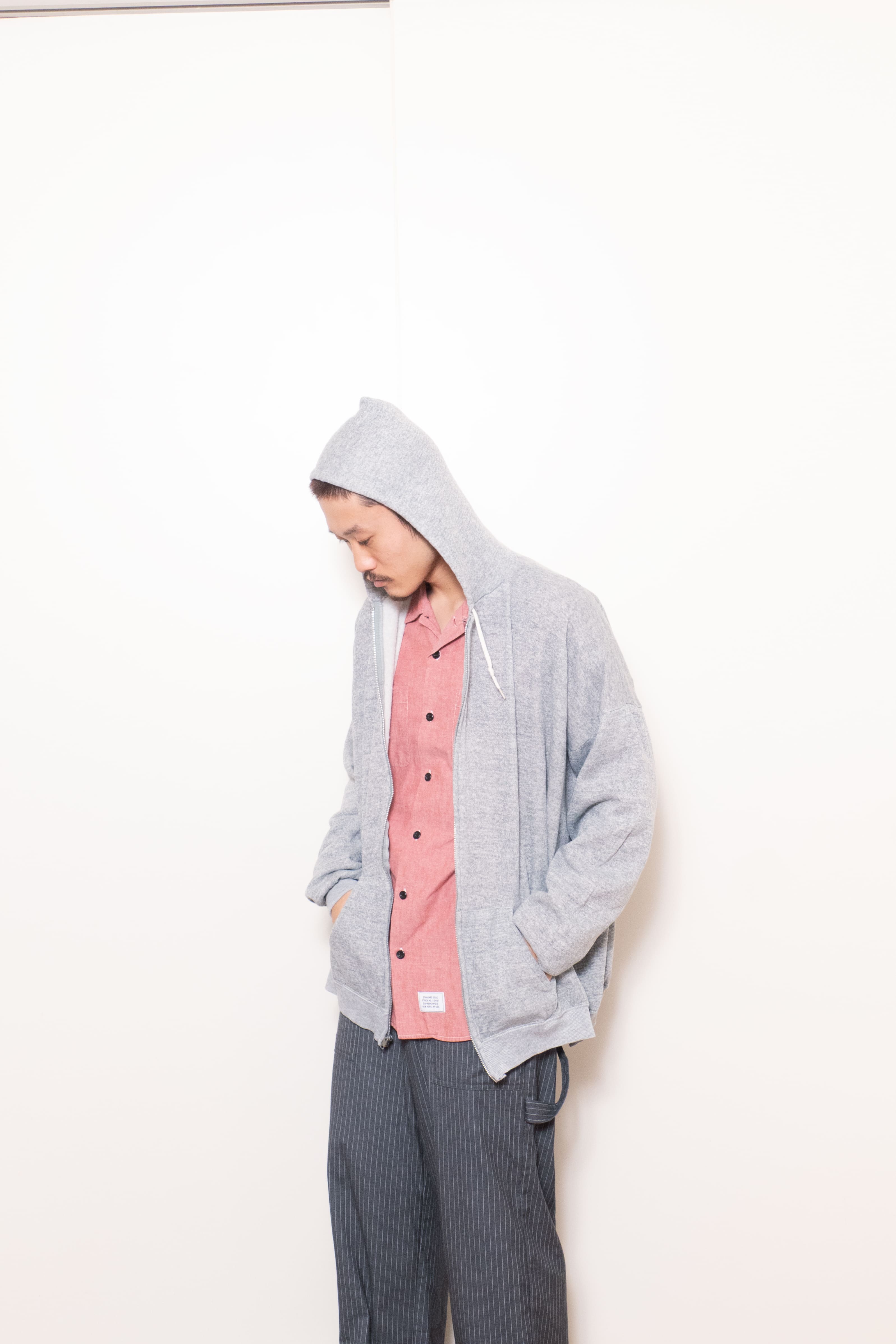 身幅がこんだけあって着丈が短いのでそりゃ調子良い。ジップフーディだけどカーディガンのようなノリで着れて面白いです。