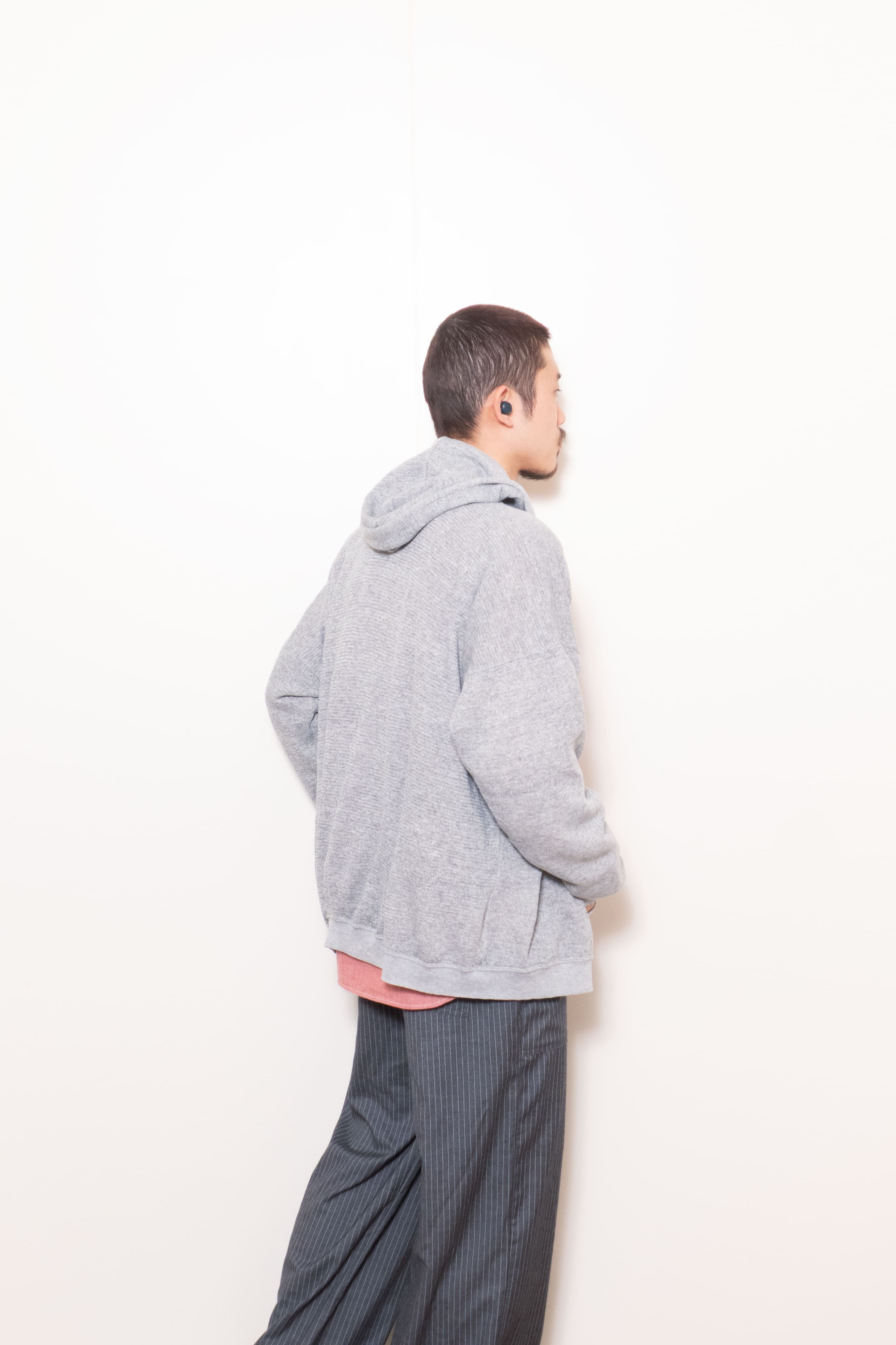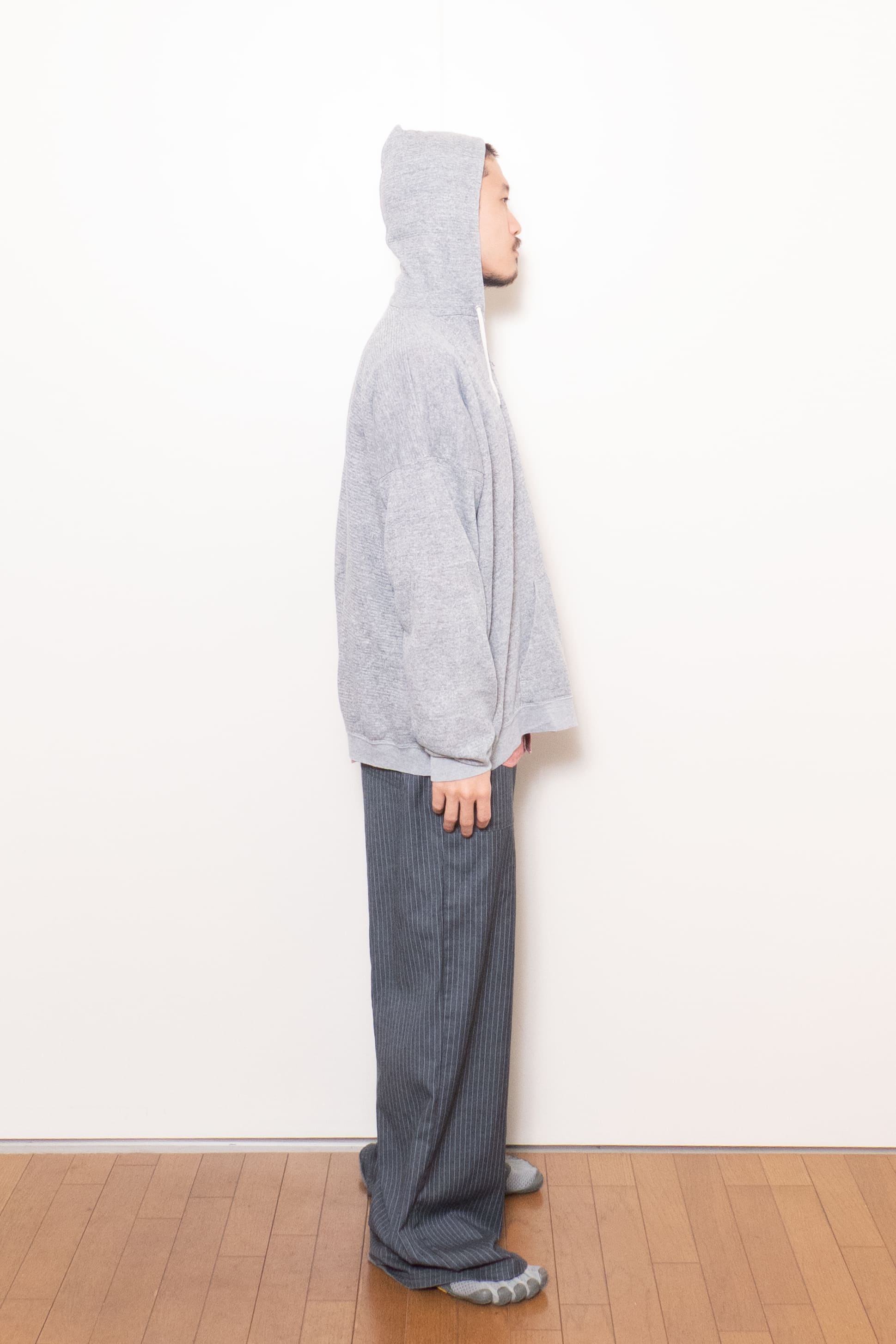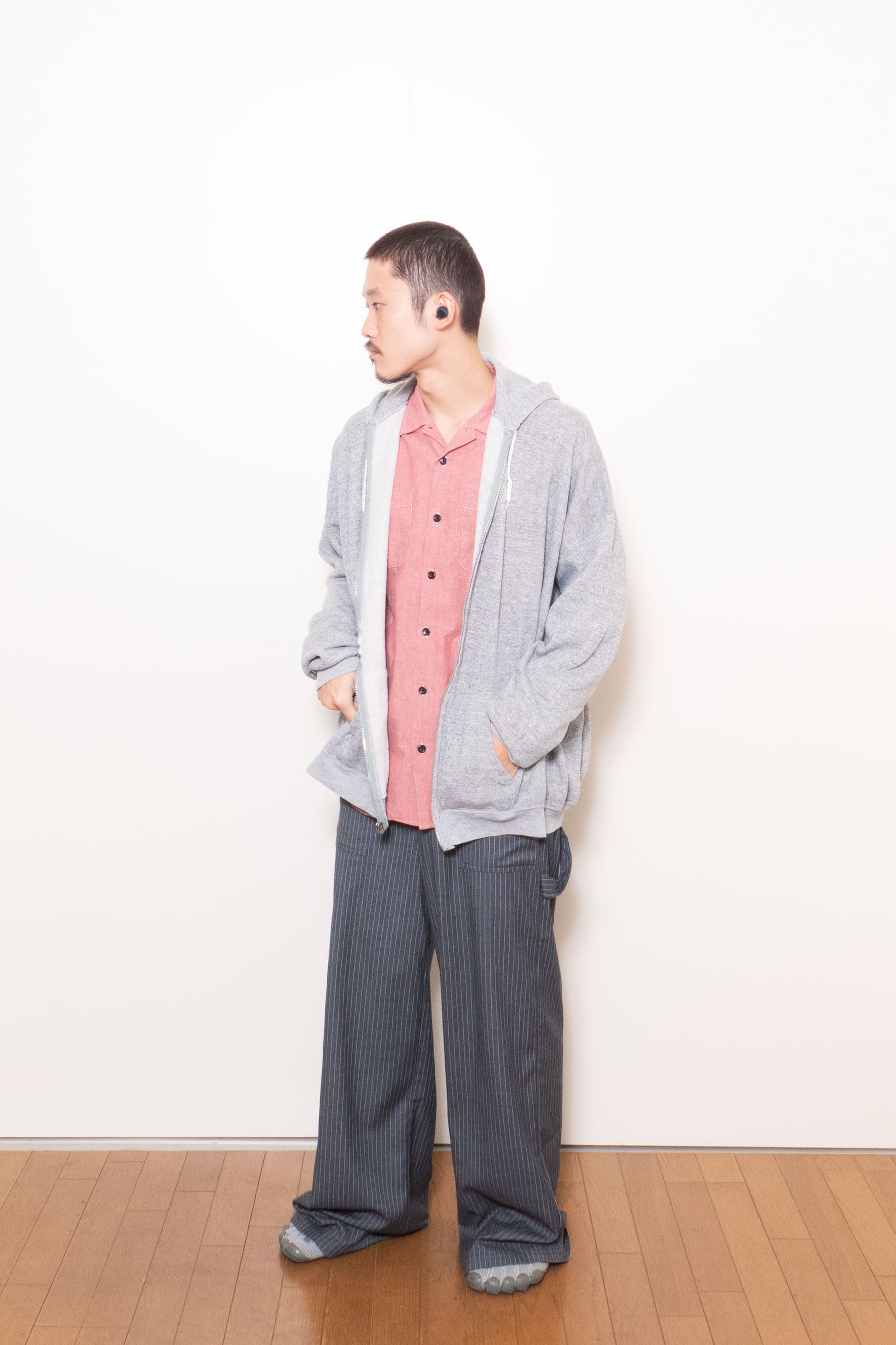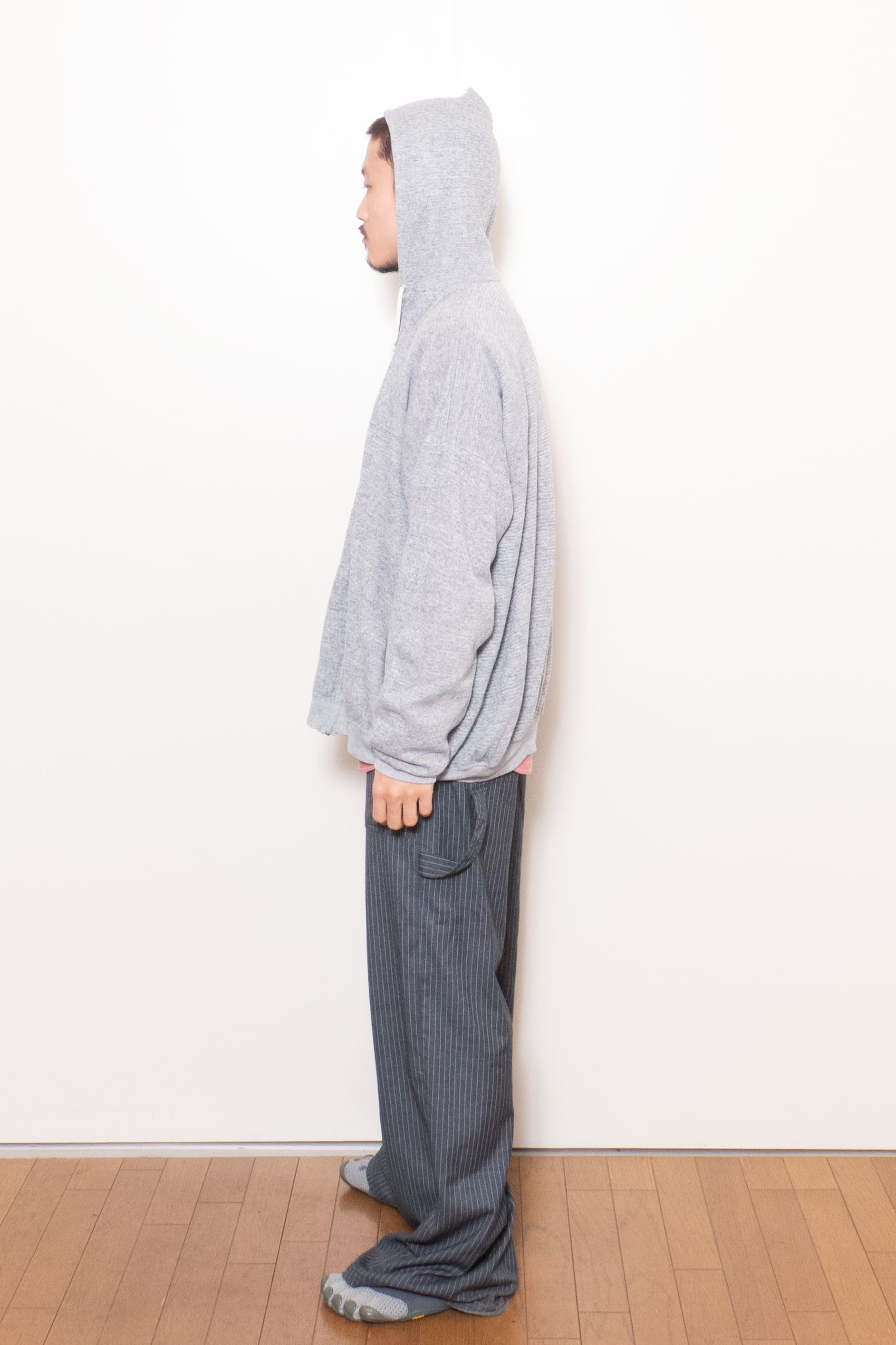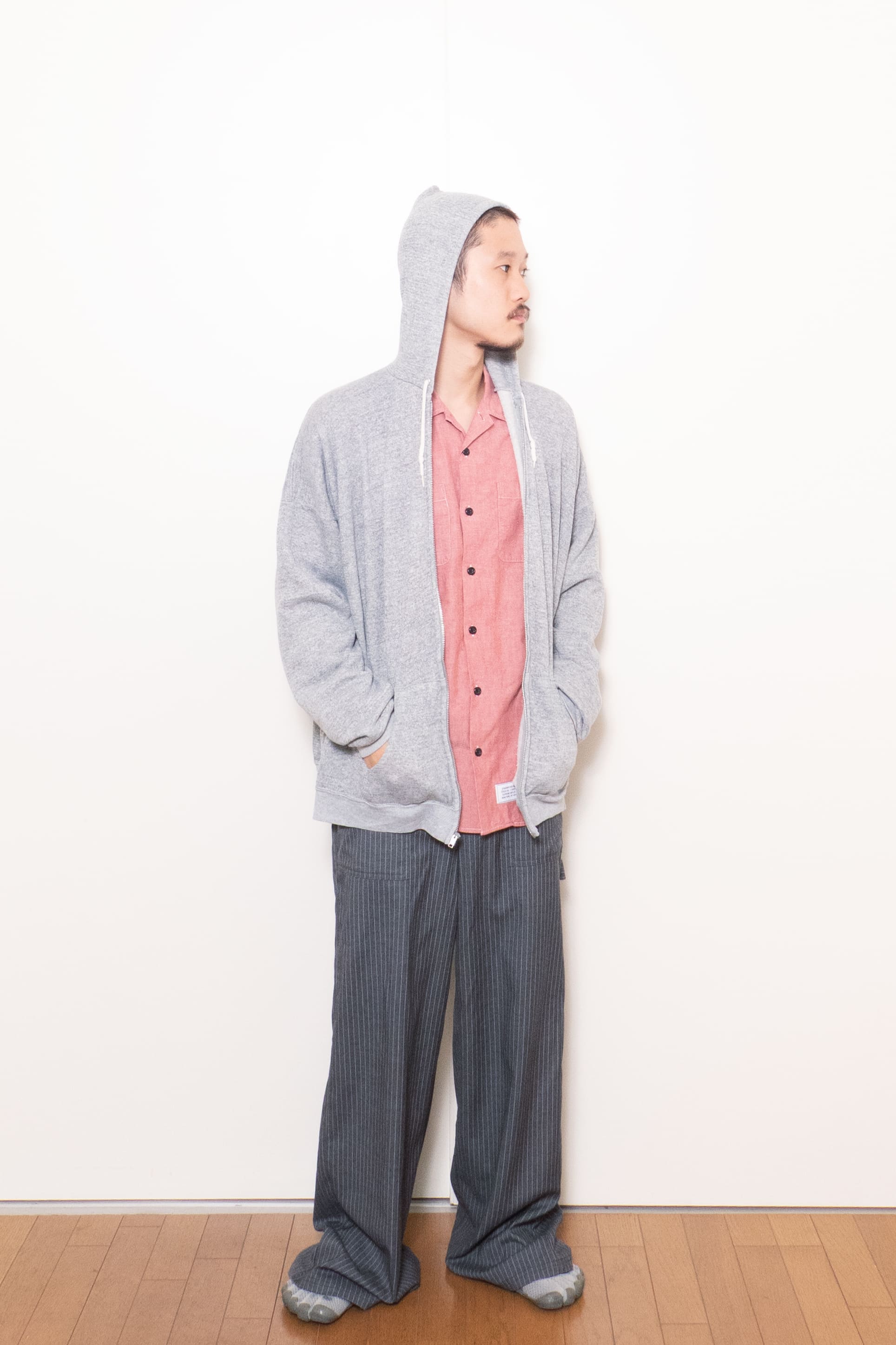 身幅がこんだけあって着丈が短いのでそりゃ調子良い。ジップフーディだけどカーディガンのようなノリで着れて面白いです。