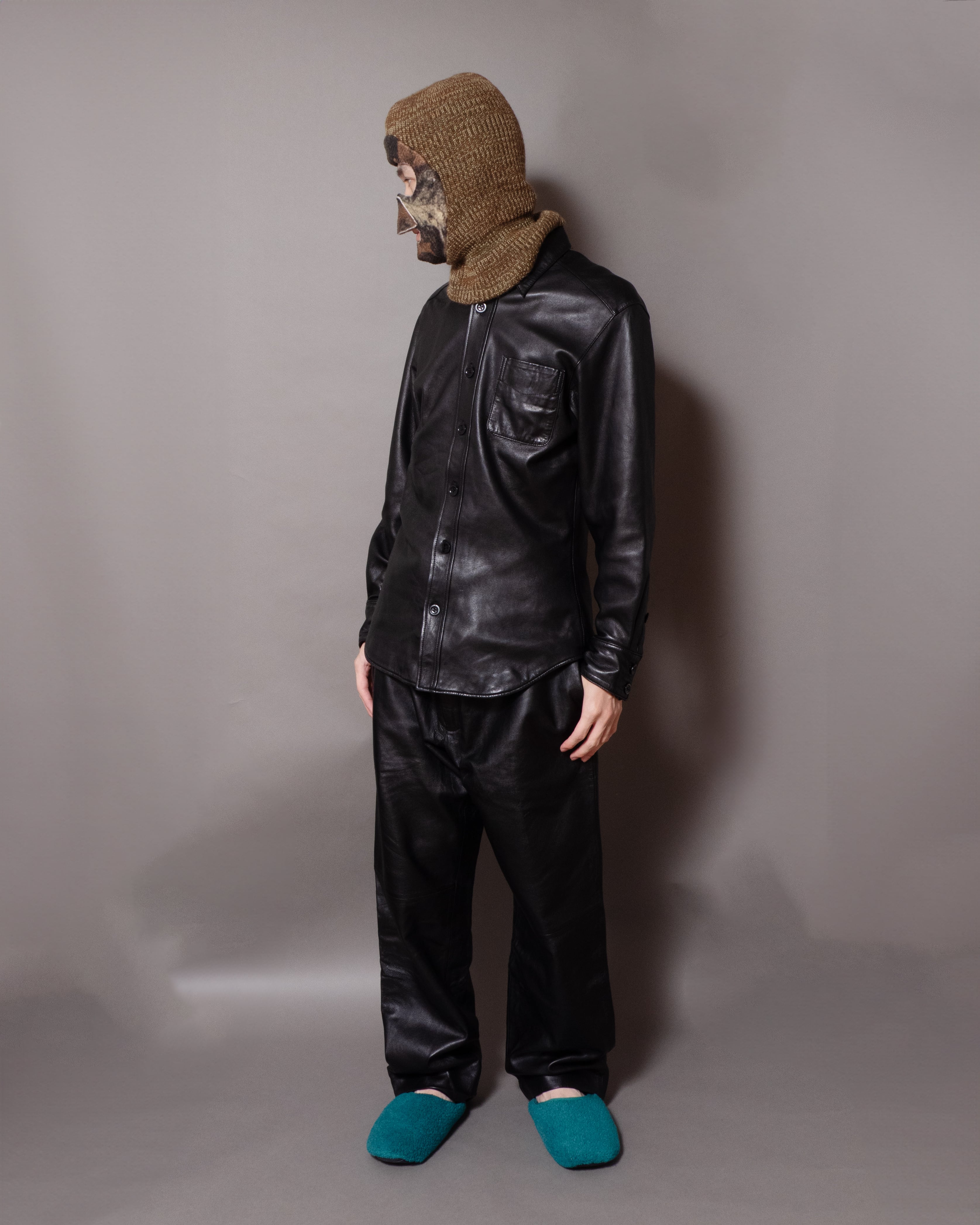 カジュアルな感じじゃなく、ドレスシャツっぽいノリの形でレザー地なのがクールです。